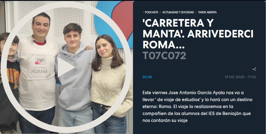 Esta entrada fue publicada en #CarreterayManTA y etiquetada #CarreterayManTA, 2º de Bachillerato, Carretera y manta, IES beniaján, Italia, Onda Regional de Murcia, Roma, Tarde Abierta, viaje, Viaje de Estudios, viajes. Guarda el enlace permanente.